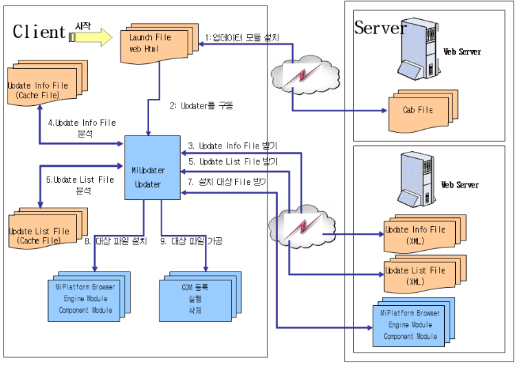사용자 PC에서 IE를 통해 배포 프로그램 모듈인 MiUpdater Cab을 다운로드하여 MiUpdater가 설치된 후 MiUpdater가 별도의 프로세스로 실행됩니다.