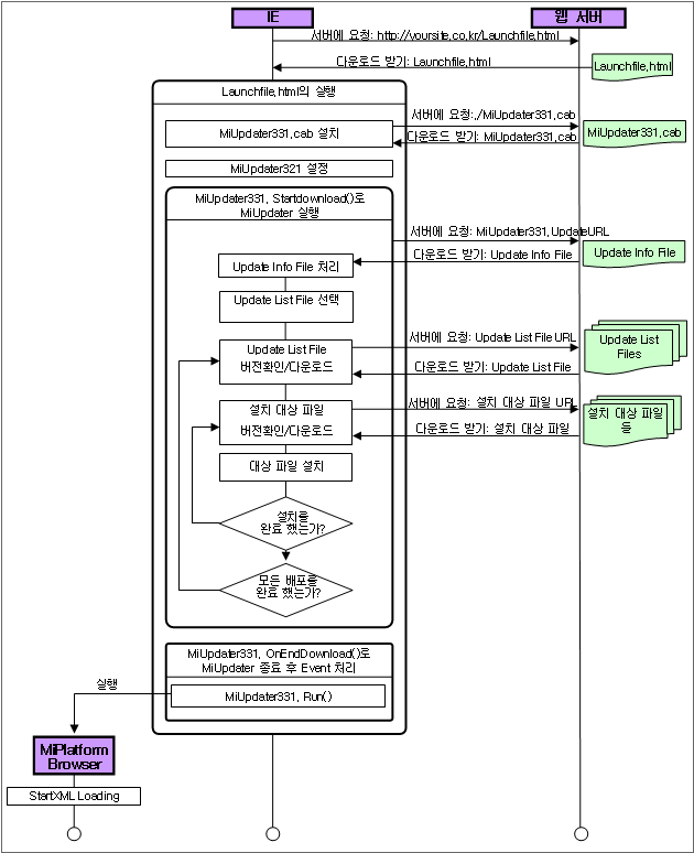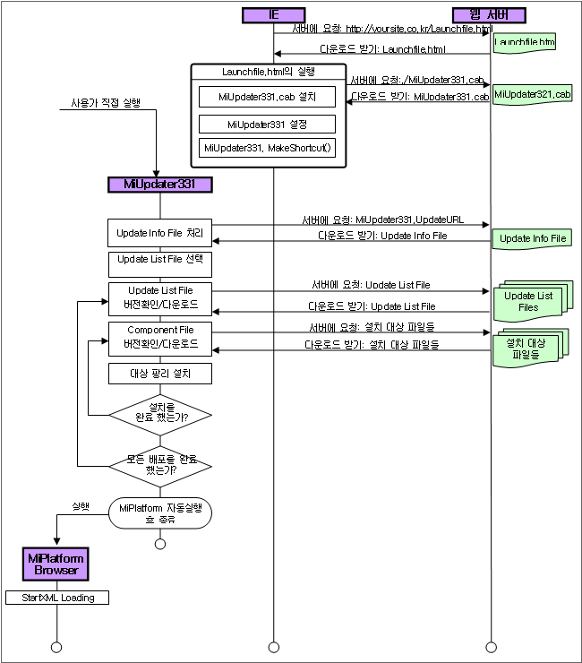 MiUpdater ActiveX는 MiPlatform의 주요 모듈인 MiPlatform(MiPlatform의 전용 Browser)과 component를 다운로드하여 설치합니다. 이 설치 과정은 IE에 MiUpdater ActiveX를 포함하여 동작하도록 구현되어 있습니다.