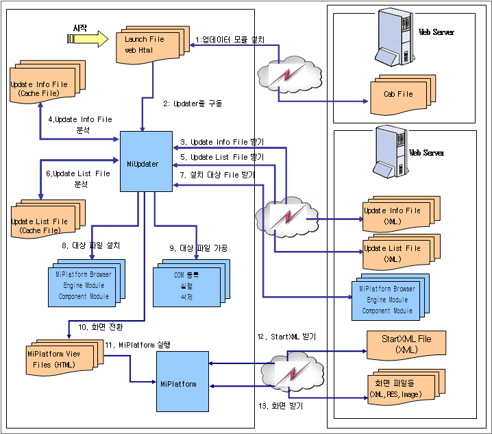 1. 사용자는 Launch File을 통해 MiUpdater를 설치합니다. 2. 구동된 MiUpdater는 Update Info File을 다운로드합니다. 3~4. MiUpdater에서 Update Info File을 받습니다. Update Info file에 포함된 Update List File의 경로 정보를 분석합니다. 이때 Update 되어야 할 List 파일을 선택합니다. 5~6. MiUpdater에서 Update List File을 받습니다. Update List File을 분석합니다. Update List File분석을 통해 설치 대상 파일의 목록과 원본의 위치를 구합니다. 7. 설치 대상 파일을 서버로부터 받습니다. 이 단계는 Update List 단위로 이루어지게 됩니다. 8~9. 설치 대상 파일을 설치 및 가공합니다. 8~9단계는 Update List 단위로 7단계가 종료된 시점에서 수행합니다. 10. MiPlatform View 화면으로 전환된 후 MiPlatform에 의해 11~13단계가 수행됩니다.