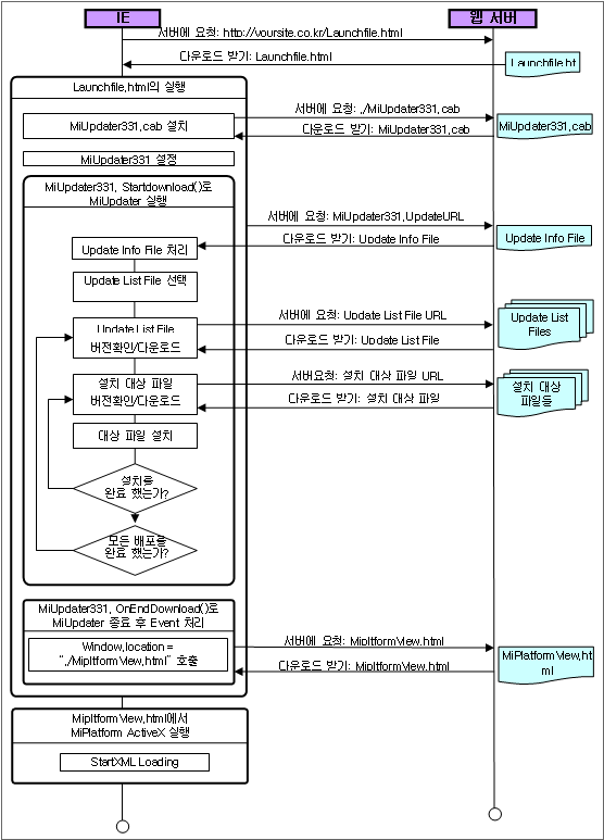 사용자 PC에서 Microsoft Internet Explorer(이하 IE)를 통해 배포 프로그램 모듈인 MiUpdater Cab을 다운로드하여 MiUpdater가 설치된 후 IE 상에서 MiUpdater ActiveX가 실행됩니다.