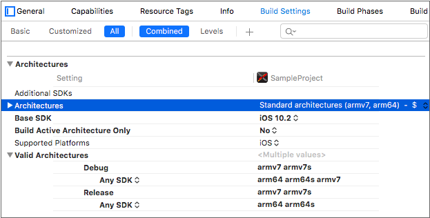iOSのバージョンアップにより、ユーザーの同意後にアクセス可能な機能に関する権限要求のための設定や機能追加による設定が必要な場合があります。iOSのバージョンに応じて、Architectures項目を追加で設定します。