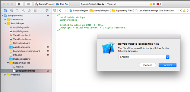 Localization.stringsファイルに対して、設定した言語に合わせたメッセージを編集します。以下は英語を設定した場合のサンプルです。