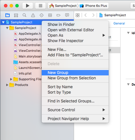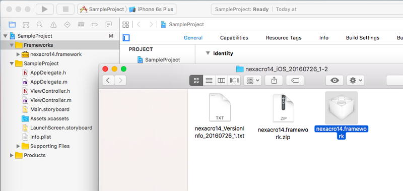 Xcodeプロジェクトで、nexacro platformに最適化された環境を作成するためのnexacro platformライブラリファイルを追加する必要があります。プロジェクトを選択し、「Frameworks」フォルダを追加します。