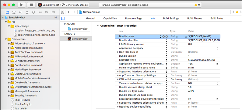 プロジェクトを選択>TARGETSを選択>画面上部のInfoタブから、設定内容を確認します。Bundle Nameに指定された値はアプリの名前になり、Bundle identifierに指定された値はアプリを識別する値になります。