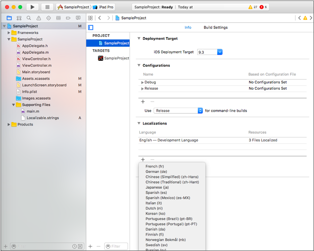 PROJECT項目を選択>「Info」タブを選択>「Localizations」カテゴリーに、上記で選択した言語が表示されます。必要に応じて、「+」ボタンにより複数の言語を追加することができます。追加された言語はプロジェクトフォルダからも確認することができます。