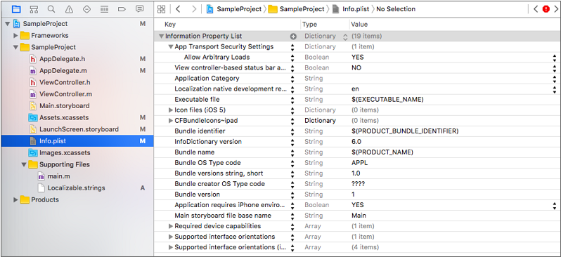 プロジェクトからInfo.plistファイルを選択し、一部の設定を変更します。「Information Property List」>「App Transport Security Settings」項目を追加>「Allow Arbitrary Loads」項目を追加し、値を「YES」に設定します。そして、「Information Property List」>「View controller-based status bar appearance」項目を追加し、値を「NO」に設定します。