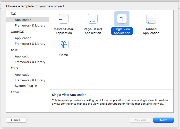 プロジェクトを生成するためのテンプレート画面から「Single View Application」を選択し、「Next」ボタンをクリックします。