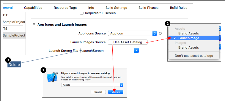 プロジェクトを選択>TARGETS項目を選択>画面上部の「General」タブから設定します。「App Icons and Launch Images」カテゴリーの項目「Launch Images Source」で、「Use Asset Catalog」ボタンをクリックした後に表示される画面から[Migrate]ボタンをクリックします。「Launch Images Source」で新規作成したAsset Catalogを選択し、項目「Launch Screen File」の値は削除します。