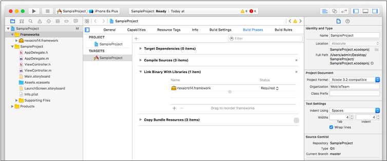 iOSが提供するAPIを使用するためのライブラリやフレームワークを設定します。Frameworksフォルダを選択>右側のTARGETS項目を選択>画面上部の「Build Phases」タブを選択>「Link Binary With Libraries」項目を選択すると、前項で追加したnexacro platformライブラリが設定されていることが確認できます。