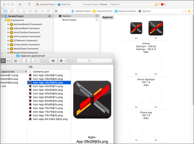 「App Icons and Launch Images」カテゴリーの項目「App Icons Source」で右側の矢印ボタンをクリックして表示される設定画面に、Finderからドラッグ&ドロップして、適切なサイズのファイルを指定します。