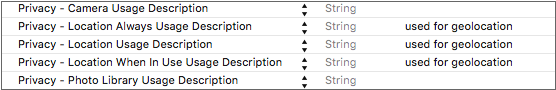 位置情報の使用、カメラおよびフォトアルバムへのアクセスに関する設定をinfo.plistに追加します。