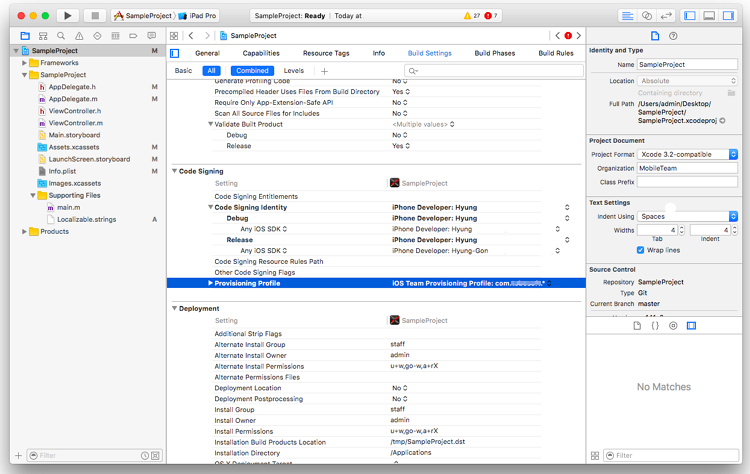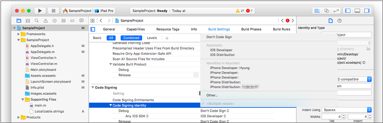 プロジェクトを選択>TARGETSを選択>「Build Settings」タブの項目「Code Signing」の「Code Signing Identity」に対して、以下のように適切なプロファイルを設定します。