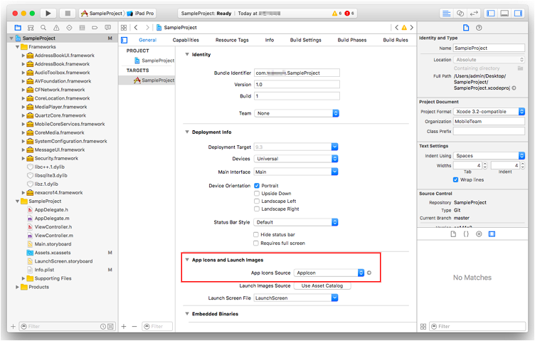 アイコンおよびスプラッシュイメージは個別に指定します。あらかじめ作成したファイルをインポートすることができます。プロジェクトを選択>TARGETS項目を選択>画面上部の「General」タブから設定します。