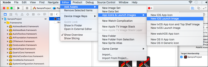 Editor > Add Assets > App Icons & Launch Images > New iOS Launch Image