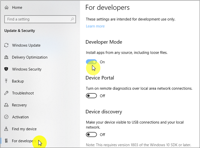윈도우 운영체제 [설정 > 개발자 기능 사용]에서 "개발자 모드"를 활성화합니다.