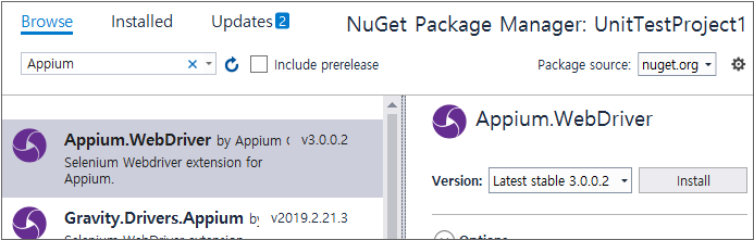 메뉴 [Project > Manage NuGet Package]를 선택하고 검색창에서 "Appium"을 입력해서 검색 결과에서 Appium WebDriver 라이브러리를 확인합니다. [Install] 버튼을 클릭하면 라이브러리를 설치합니다.
