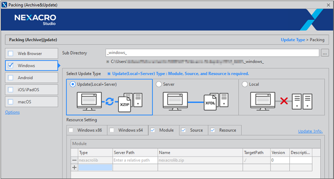 Packingウィザードで実行環境を選択して、配布するモジュール、ソース、リソースを選択します。OSのタイプに合わせて、NRE項目を選択します。