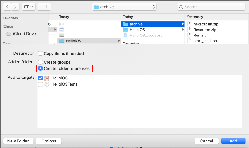archiveフォルダを選択して、フォルダの追加オプションで「Create folder references」を選択した後、「Add」ボタンをクリックします。