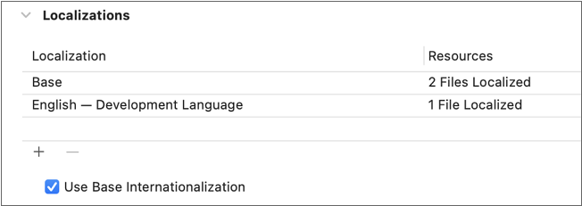 英語以外の言語をサポートするには、[プロジェクト>Info>Localizations]にて[+]ボタンを押下して、他の言語を追加することができます。
