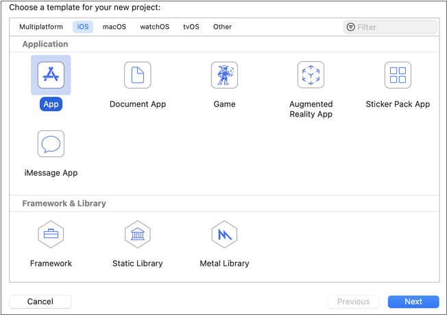 プロジェクト生成のためのテンプレート画面にて、「App」項目を選択します。