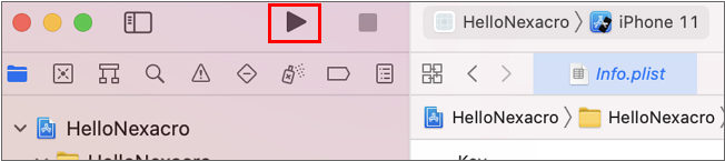 Run機能を実行します。画面の上部のアイコンを直接クリックするか、Xcodeのメニューから実行することができます。
