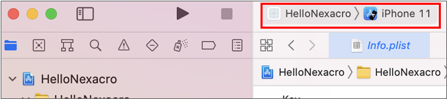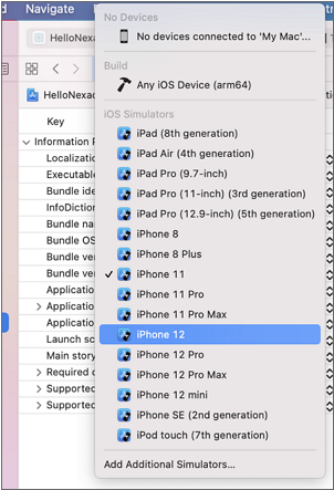 Xcodeの上部のTarget Nameをクリックして、下記のようにアプリを実行するiOS用端末やシミュレータを選択します。
