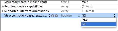 Info.plistファイルを選択し、プロパティリストから「View controller-based status bar appearance」項目を追加して、値を「NO」に設定します。