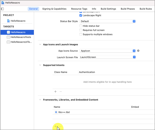 iOSで提供されるAPIを使用するために必要なライブラリとフレームワークを設定します。プロジェクトを選択して、TARGETS項目を選択すると、画面上部に「General」というタブを確認することができます。該当タブを選択すると、「Frameworks, Libraries, and Embedded Content」項目が表示される場所でライブラリとフレームワークを追加します。