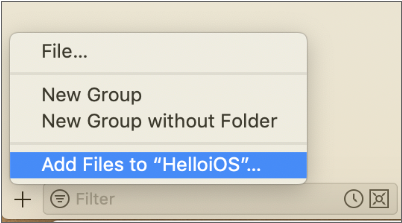 Xcodeのプロジェクトエクスプローラの下部の「+」ボタンをクリックして、Add Files to"プロジェクト名"を選択します。