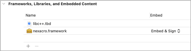 nexacroライブラリは、圧縮ファイル形式で提供され、nexacro.framework.zipというファイル名で提供されます。「Frameworks, Libraries, and Embedded Content」項目から[+]ボタンをクリック>Add Files項目を選択し、nexacro.framework.zipファイルを選択します。提供されるファイルは、圧縮を解放して生成されたプロジェクトのFrameworksグループにドラッグします。