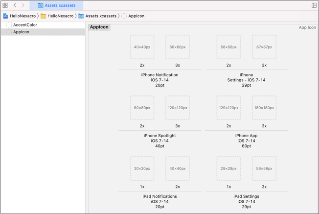 「App Icons Source」項目の横にある矢印をクリックすると、下図のようにアセットカタログからアプリのアイコンを設定することができます。予め製作したアイコン画像を端末と用途に合った位置にドラッグ&ドロップします。
