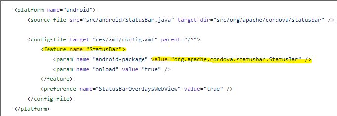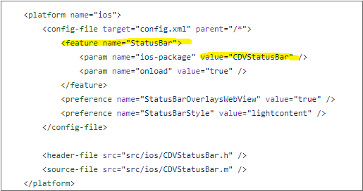 ... <plugin name="StatusBar" class="CDVStatusBar" onload="true"/> <preference name="StatusBarOverlaysWebView" value="false" /> <preference name="StatusBarBackgroundColor" value="#FFFF00" /> ...