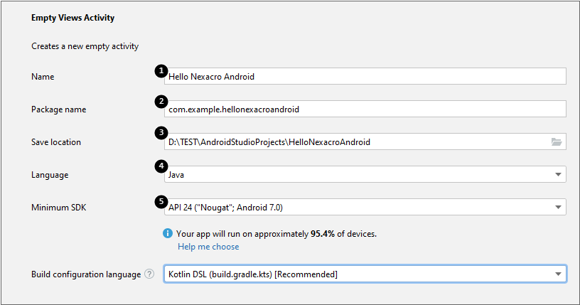 The minimum level of Android that Nexacro supports is 5.0. Accordingly, you should choose an SDK that supports the API level 21 or higher.