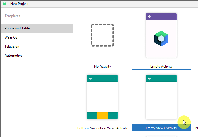 Selection of templates affects an app structure, screen layout as well as the composition of files. Since it is enough for us to have a basic project that just can contain a Nexacro-based app, select Empty Views Activity and click Next.