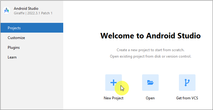 Unless you have already opened a project , create a new project in the Welcome to Android Studio window. Click Create New Project as seen in the below picture.