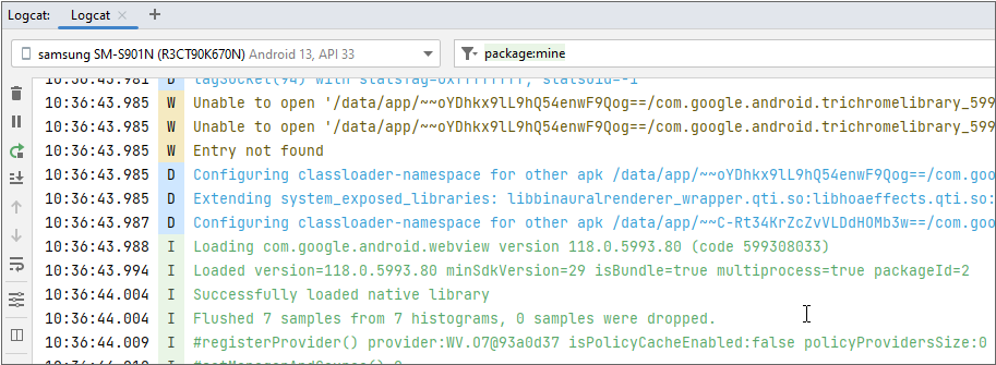 You can see the log messages for executing the app through the Logcat window, which is situated at the bottom of the Android Studio screen.