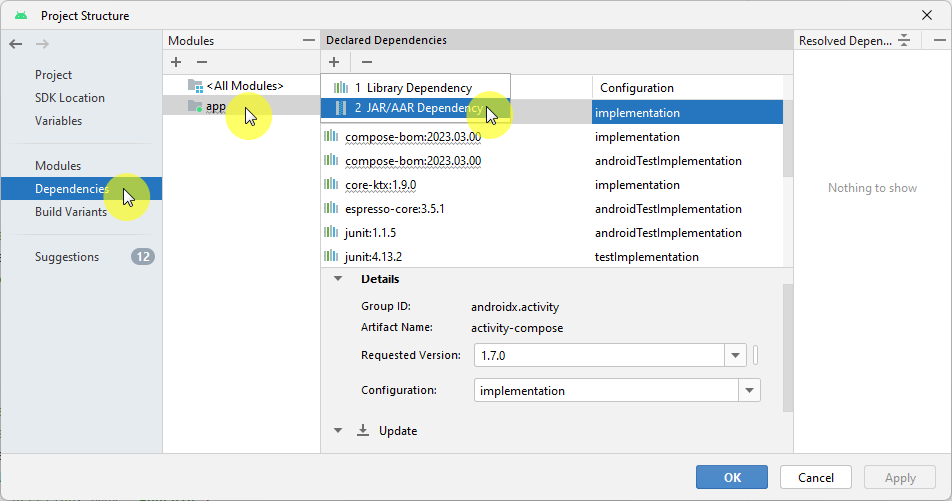 Confirm that the aar file is added to the app > build.gradle.kts file.
