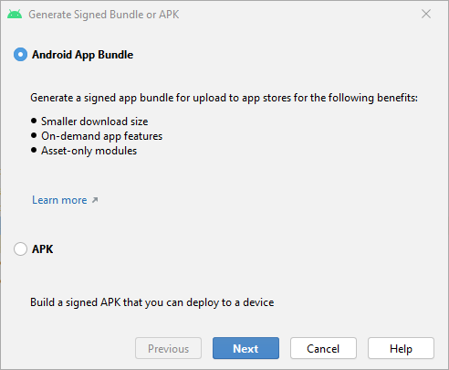 The default setting is to generate AAB files. If needed, you can select an APK item and generate an APK file.