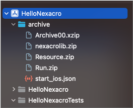 앱 실행에 필요한 파일은 모듈, 소스, 리소스 그리고 Run.zip과 start_ios.json으로 넥사크로 스튜디오에서 Packing(Archive&Update)을 수행하여 얻을 수 있습니다. 이 파일을 Xcode 프로젝트에서 archive 폴더에 적재한 후 앱을 빌드하면 네트워크 연결 없이도 앱을 실행할 수 있습니다.