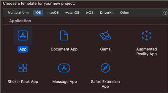 프로젝트 생성을 위한 템플릿 화면에서 'App' 항목을 선택합니다.