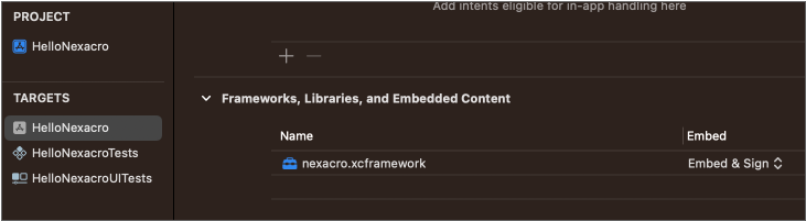 기본 라이브러리인 nexacro.xcframework는 필수 설정 대상이며 나머지 항목은 앱에서 사용하는 Device API에 따라 필요한 항목만 추가합니다.