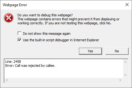 特にモードレスウィンドウから、showModalメソッドを実行するADL内の共通スクリプト関数を実行した場合、モーダルウィンドウを生成してから閉じる際に参照問題によるスクリプトエラーが発生することがあります。下記のソースコードの例をご参照ください。ユーザーシステムによって、スクリプトエラーの内容が異なったり重複して発生する場合があります。