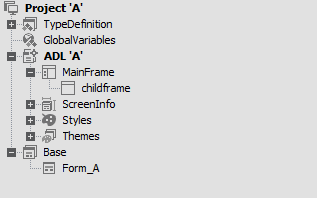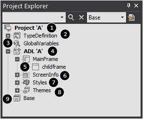 nexacro studio上のProject Explorer画面で取り扱う内容のほとんどは、ADLファイルに保存される内容です。以下はnexacro studioのProject Explorer画面です。