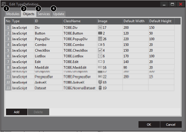 Type Definitionファイルは、nexacro platformアプリケーションが必要とするファイルに関連する情報を持っています。nexacro platformで使用されるコンポーネントは、Javaスクリプトに基づいて作成されました。ロジックが実装されたJavaScriptファイルをモジュールといい、この中で、アプリケーション開発に使用するオブジェクトを開発時に選択することができます。その他のアプリケーションの開発時にサービスグループを定義し、配布に関連するオプションを設定します。
