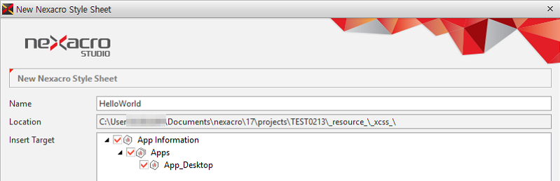 New Style Sheet画面でXCSS名とパス、適用対象を設定します。