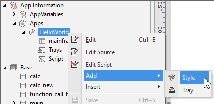 Project Explorerで、下図のようにApplicaton名を選択した後、マウスの右ボタンをクリックして、コンテキストメニューから[Insert > Style]を選択します。