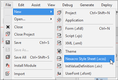 nexacro studioのMenuから[File > New > Nexacro Style Sheet(.xcss)]を選択します。