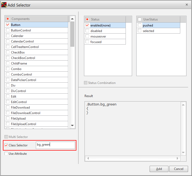 Add Selectorウィンドウでスタイルを定義するコンポーネントを選択して、Class Selector名を設定します。