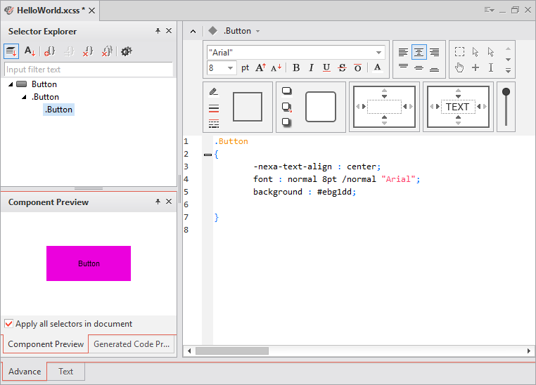 上記のように.Buttonセレクタのスタイルコードを作成した後、HelloWorld.xcssファイルを保存します。