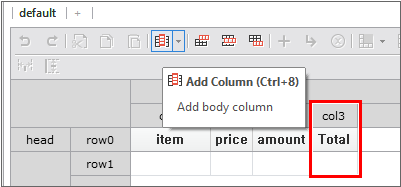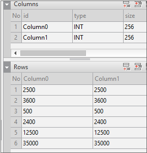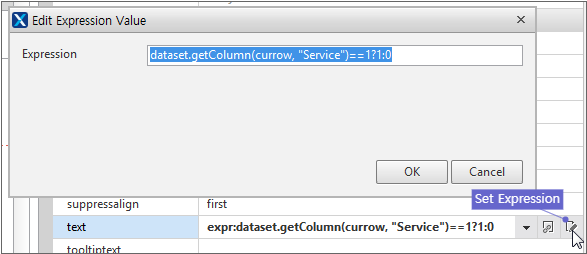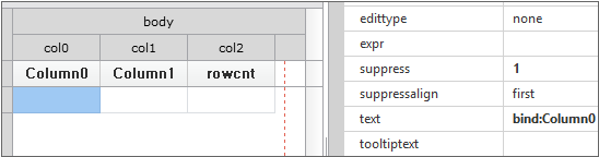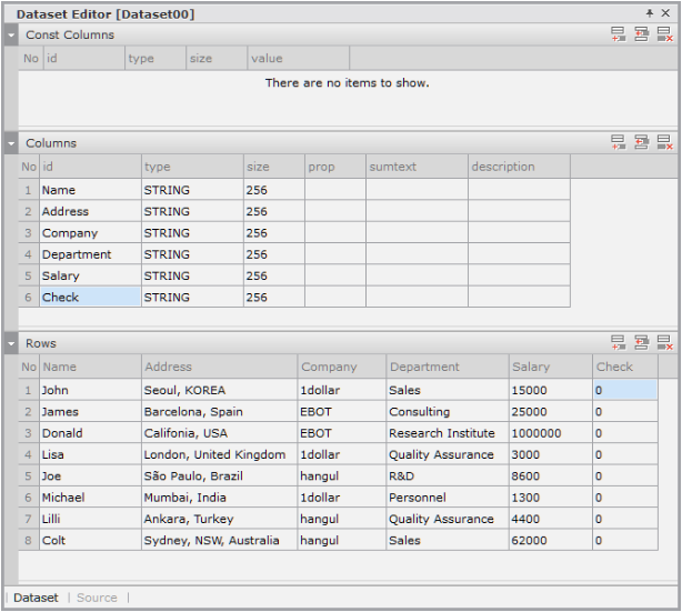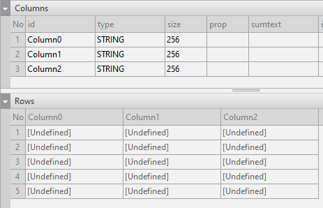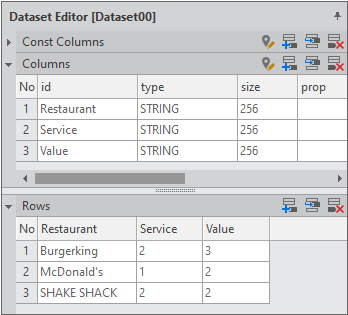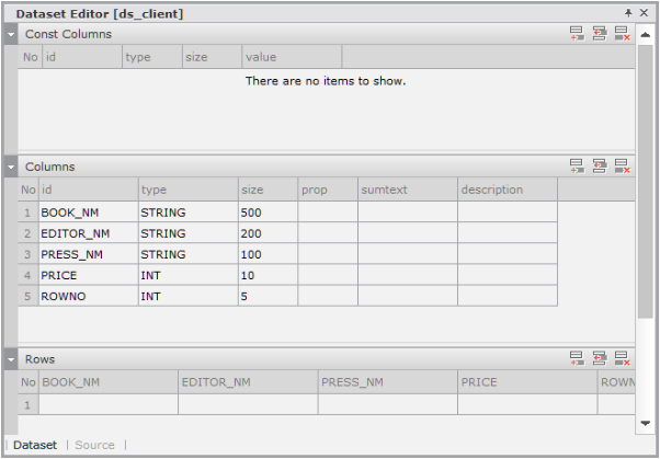Enter the data item list in the created Dataset. If you double-click Dataset in the Invisible Objects area, then the Dataset Editor appears. Enter Columns and Rows as shown in the figure below.